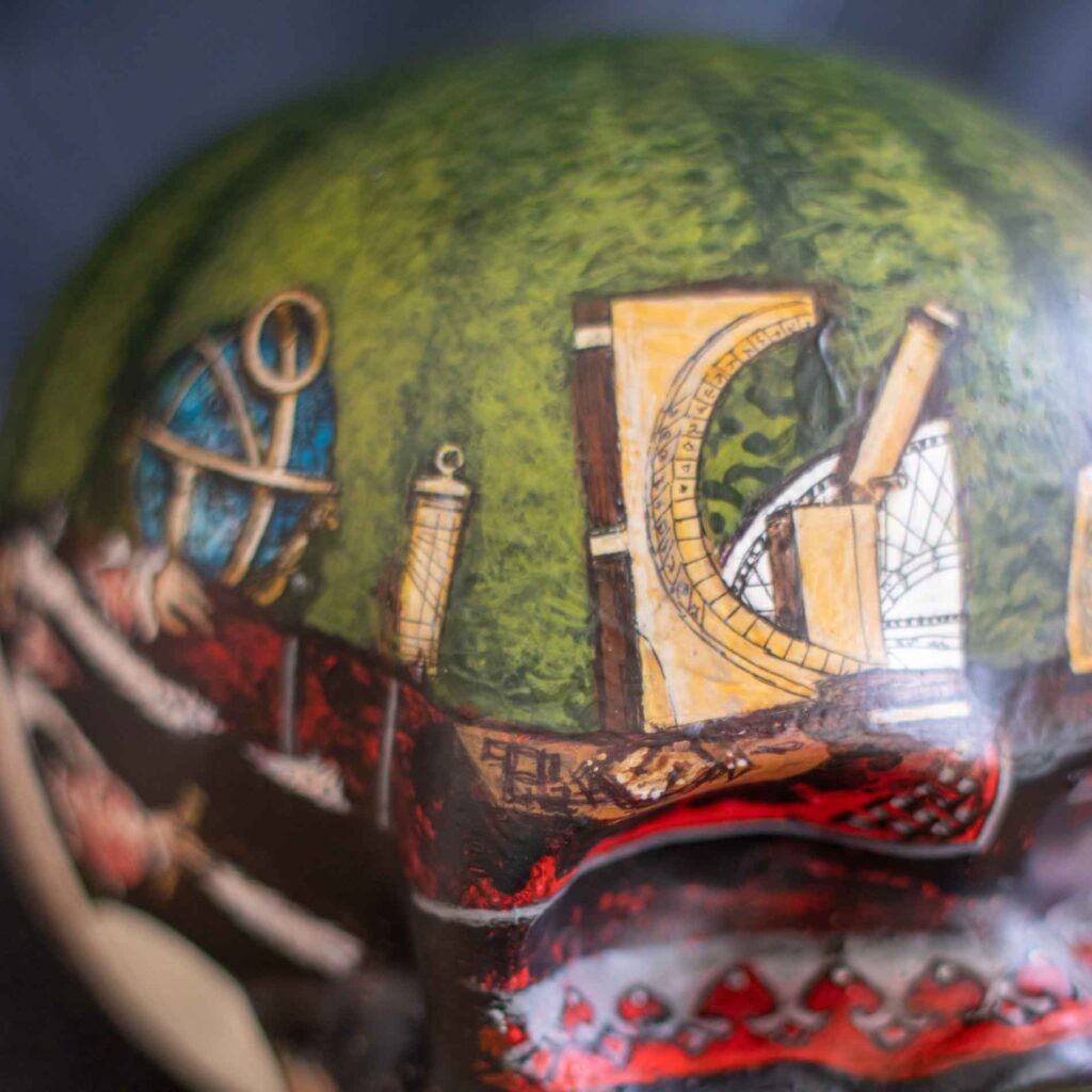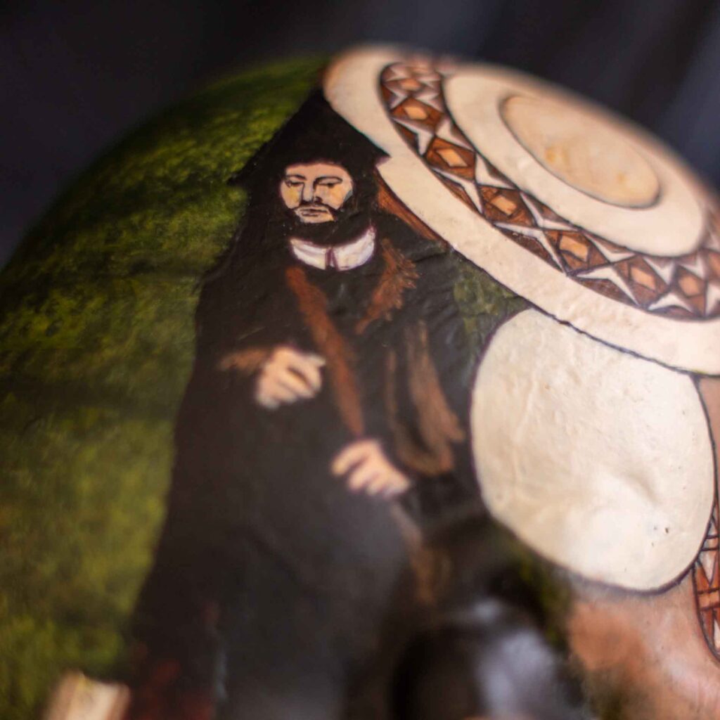 In the previous two years I’d created a Treasure Skull and a Cyberpunk for Local Color’s 31 Skulls fundraiser. For this year, I created an homage to a famous skull of art history: the distorted skull from Hans Holbein the Younger’s painting “The Ambassadors”.
