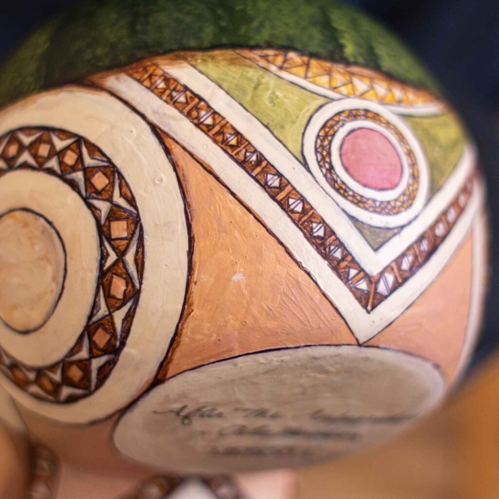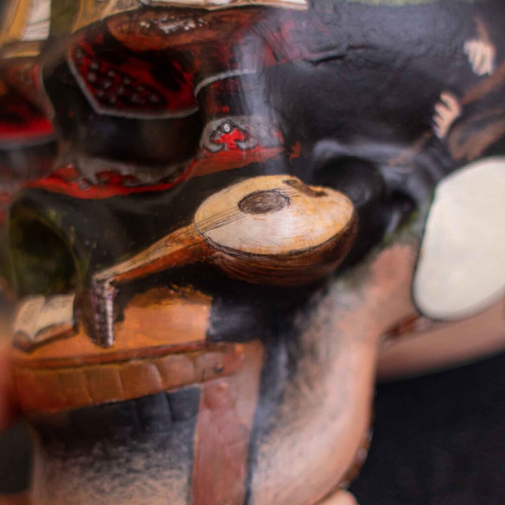 So instead of an anamorphic skull on a painting, I made an anamorphic painting on a ceramic skull. The floor details wrapped readily around the base of the skull. And the table lined up nicely with the jaw, as did the lute with the cheekbone.
