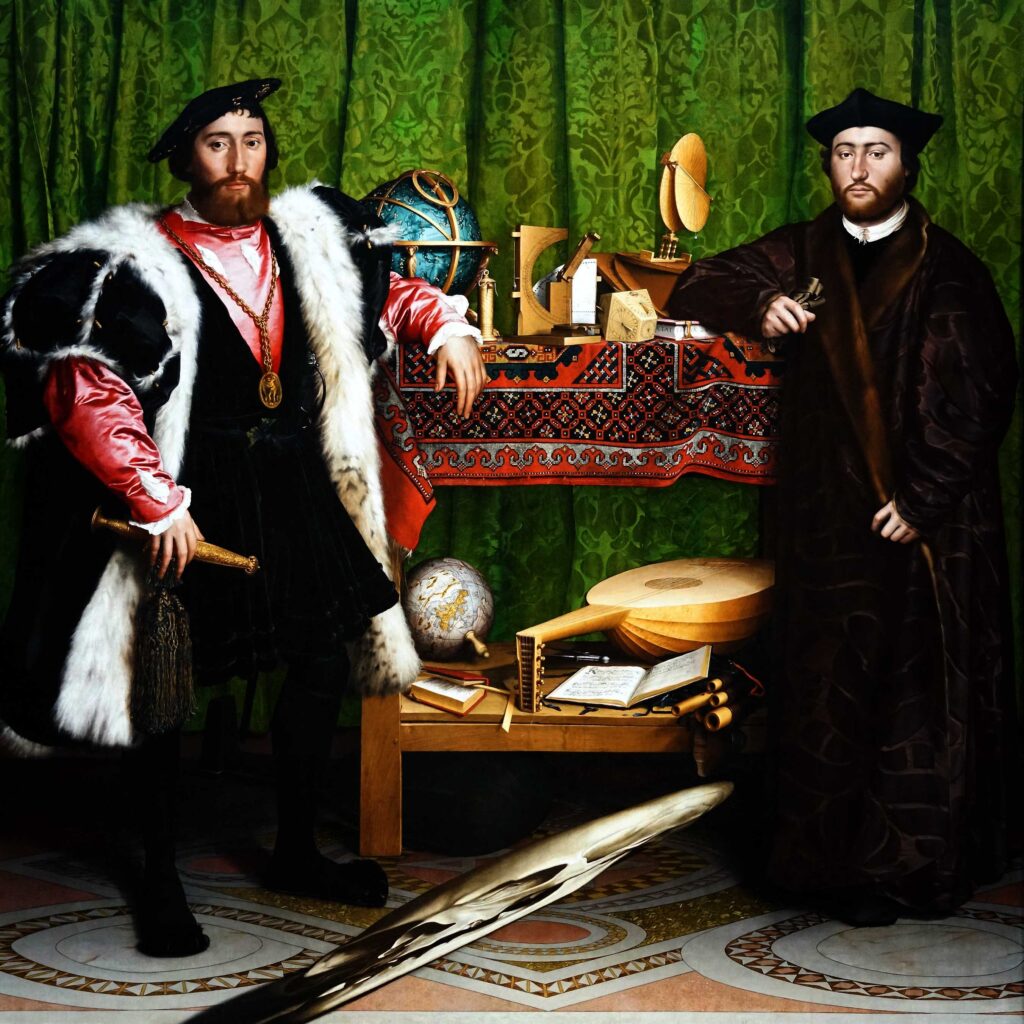 “The Ambassadors” contains many of the techniques of the day that were pleasing to wealthy patrons who commissioned portraits: the tile floor and fabrics are rendered in luxurious detail, the objects are detailed and meaningful to tell the story of who they are, and (or course) the portraiture is highly flattering. But it goes a step beyond. Besides the crisp perspectives (ah, lutes) there is also a somewhat bizarre trompe l’oeil of an anamorphic skull at the bottom only visible from a particular angle by a viewer on the lower left.